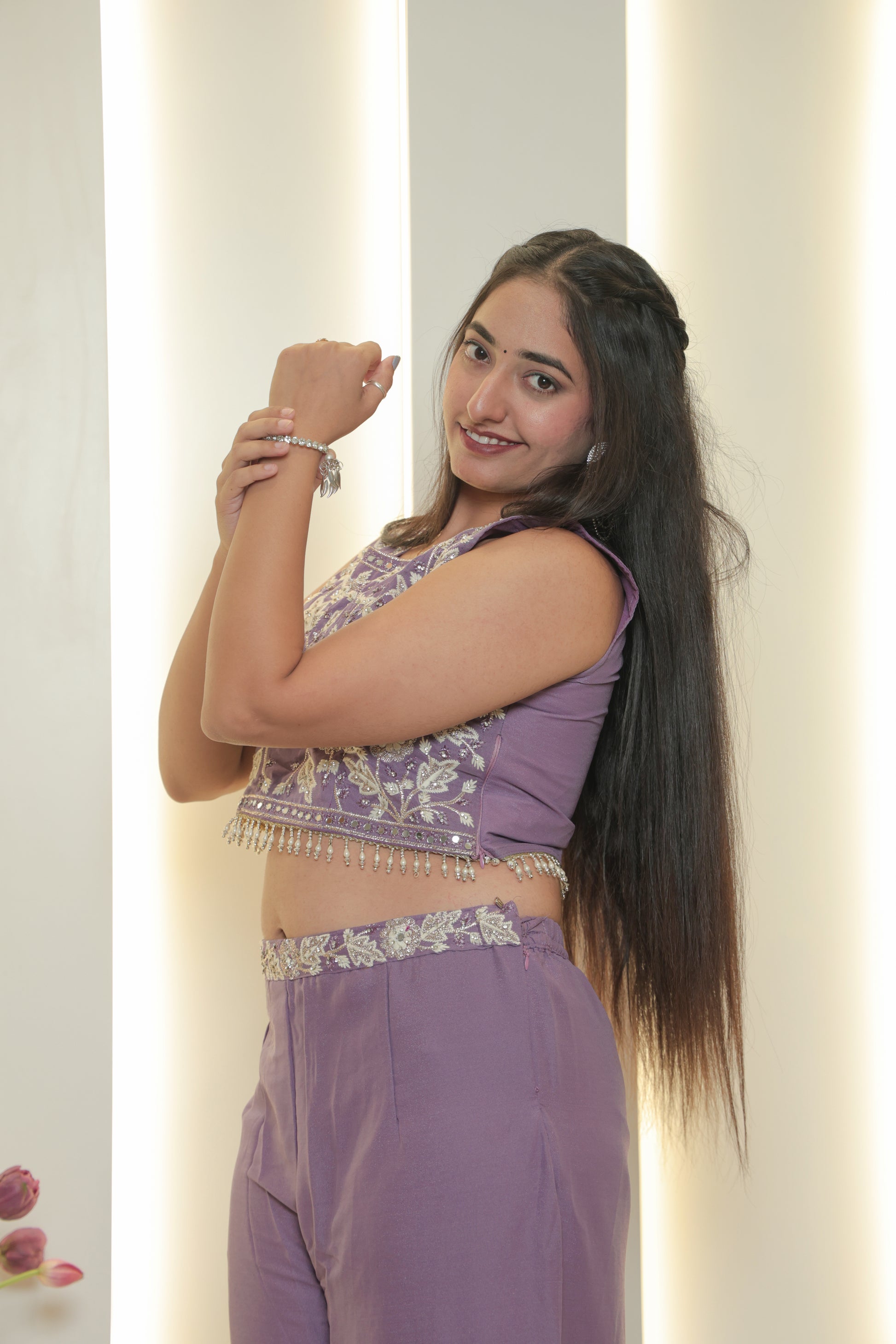 This stunning lavender co-ord set blends elegance with a modern twist. The outfit features a beautifully embroidered crop top with delicate floral motifs and bead tassel detailing at the hem, paired with high-waist straight-fit trousers for a chic look. A sheer flowy cape adds a touch of drama and sophistication, making it perfect for cocktail parties, festive celebrations, and wedding events. Crafted from lightweight, breathable fabric, this ensemble ensures both comfort and a graceful silhouette.