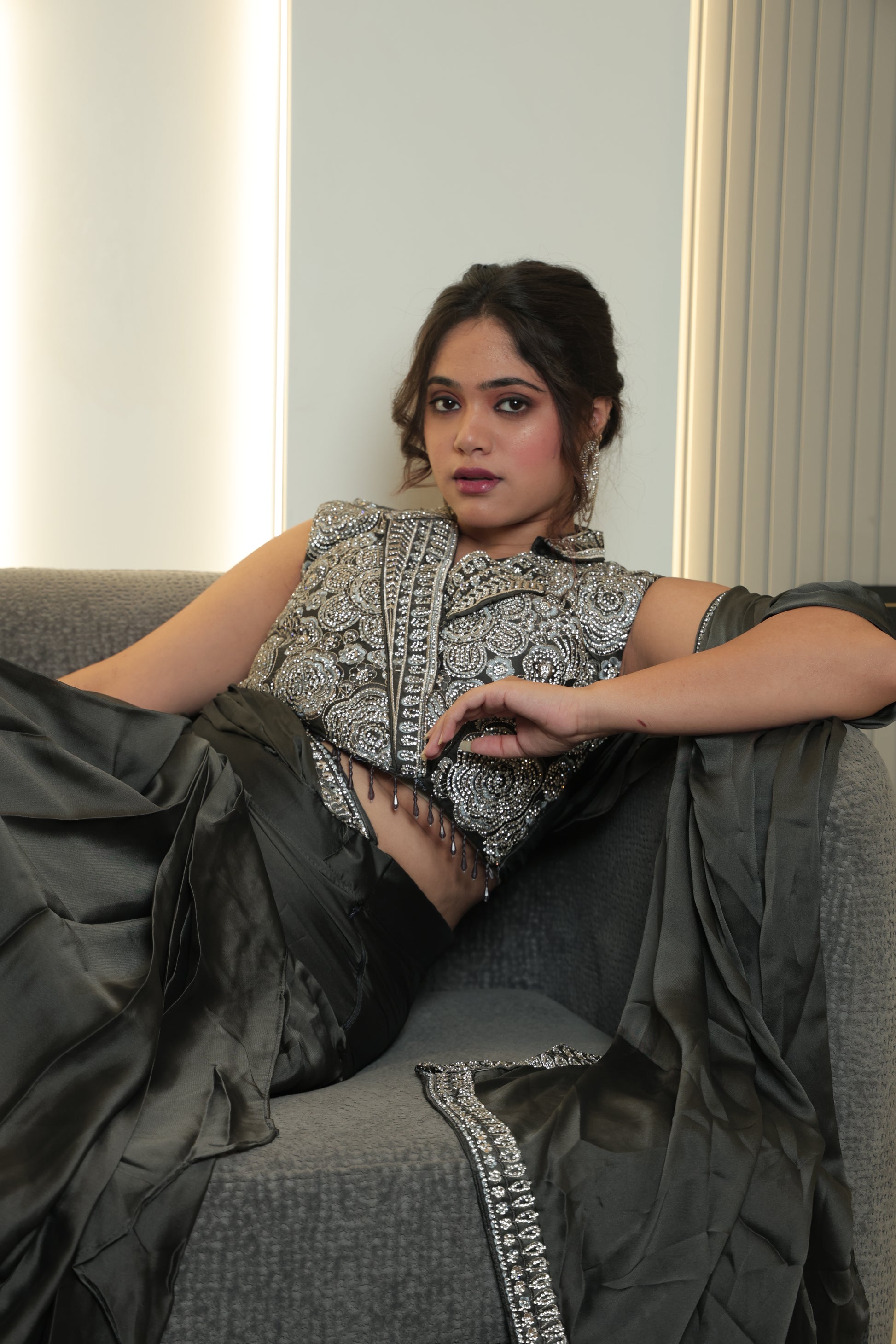Step into effortless sophistication with the Elira Midnight Elegance Ready-to-Wear Saree. Crafted in a luxurious deep black hue, this drape is designed for the modern woman who values both style and comfort. The pre-stitched silhouette ensures a perfect fit without the hassle of traditional draping, while the intricately embroidered blouse adds a regal touch of shimmer and detail. Paired with a lightweight dupatta that flows gracefully, this ensemble is perfect for festive nights, weddings, and grand celebrations. With Elira, elegance becomes effortless.