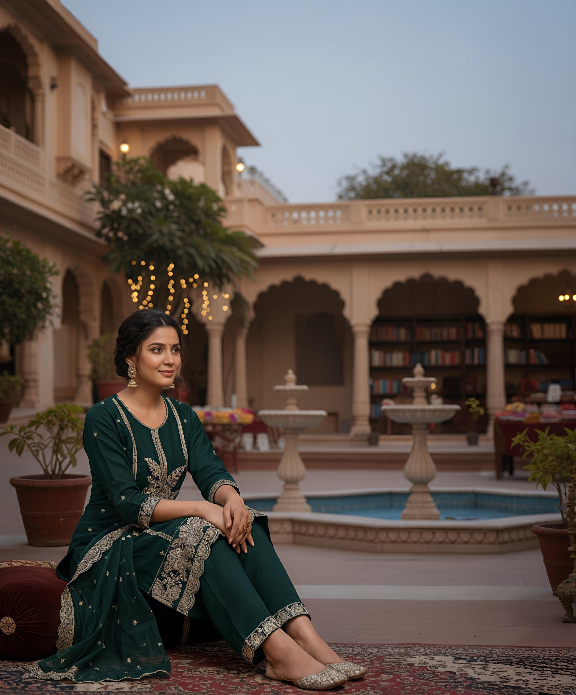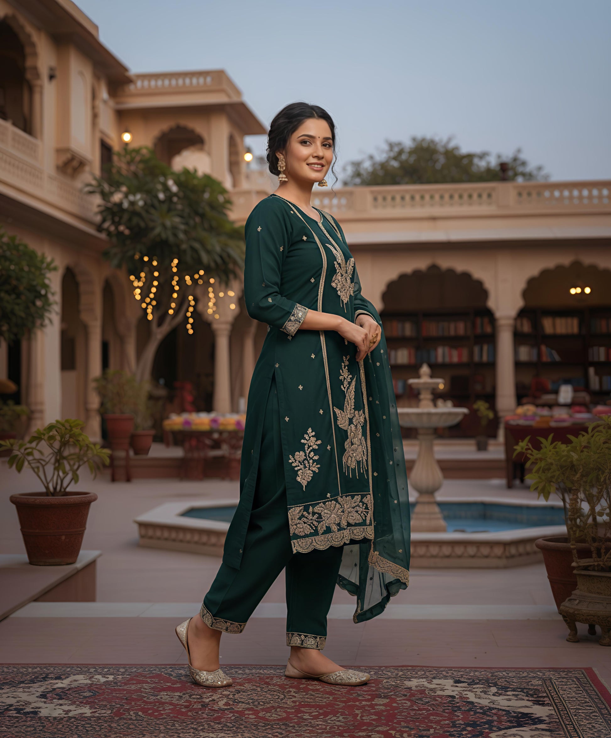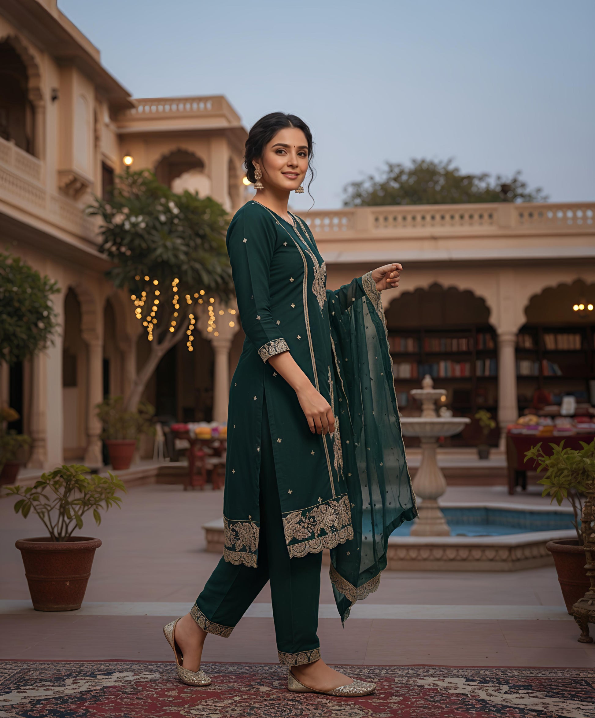 Step into a world of timeless elegance with The Elira Forest Dream Set. This exquisite three-piece ensemble, in a captivating shade of deep forest green, is designed to make you feel like royalty. The straight-cut kurti is adorned with intricate golden embroidery, featuring delicate floral and paisley motifs that beautifully contrast against the dark fabric.