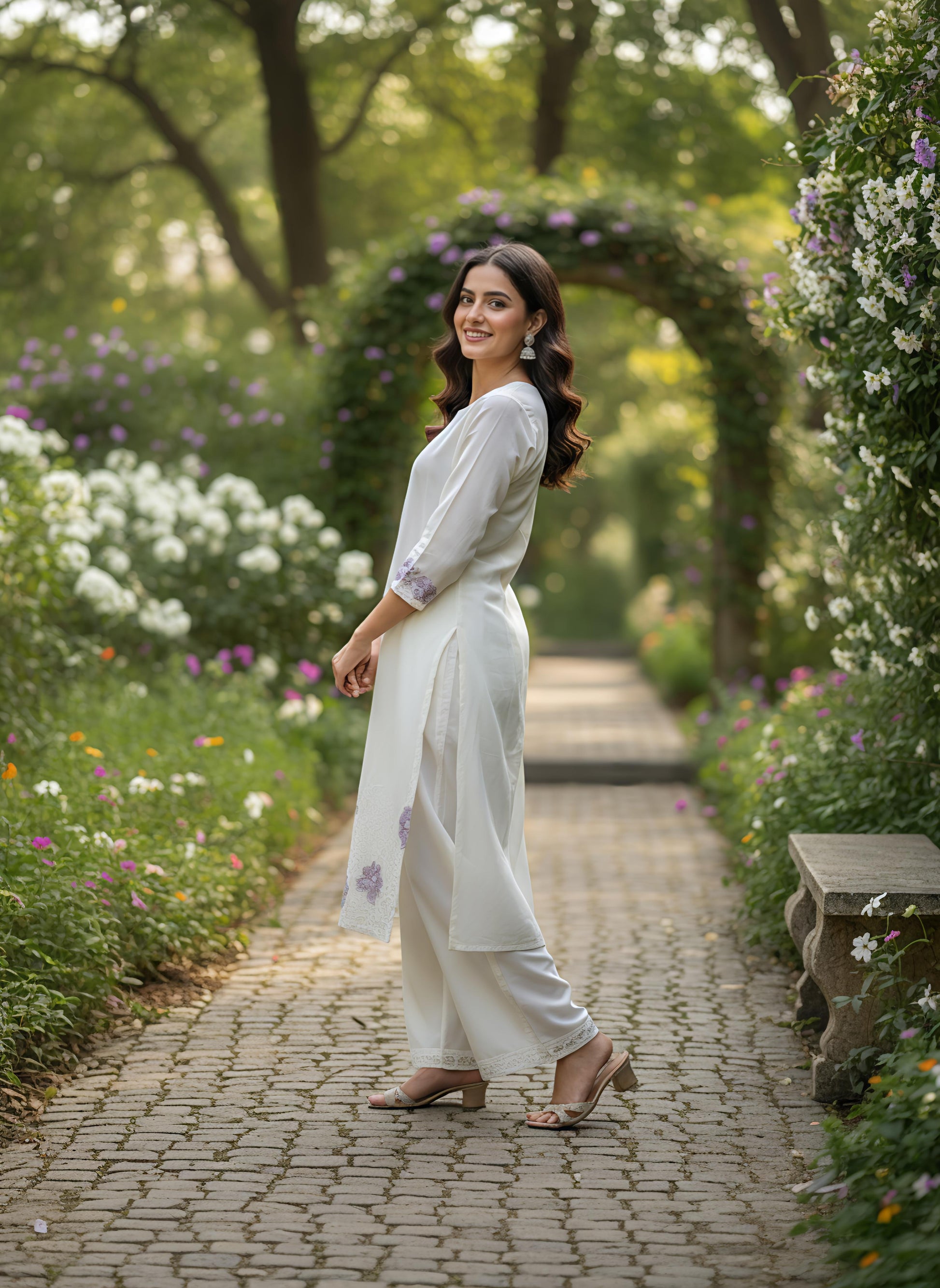 Embroidery: The outfit is subtly adorned with delicate lavender or light purple thread embroidery in a floral or vine motif.
