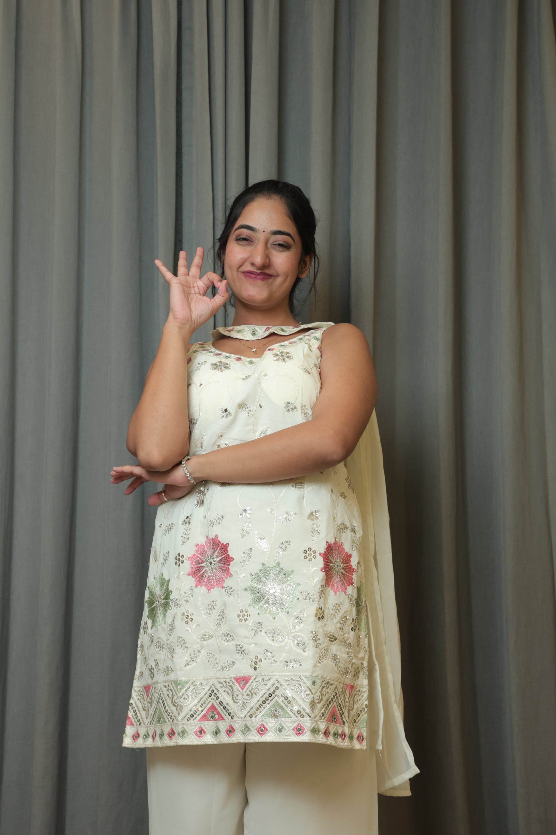 Step into effortless elegance with this ivory palazzo suit set. The sleeveless kurta is beautifully adorned with delicate mirror work and pastel floral embroidery in shades of pink and green, finished with a geometric embroidered border for a refined touch. Paired with wide-leg palazzo pants in matching ivory, this lightweight ensemble is perfect for festive gatherings, summer celebrations, and daytime events. Its chic neckline design adds a modern twist to a classic ethnic look.