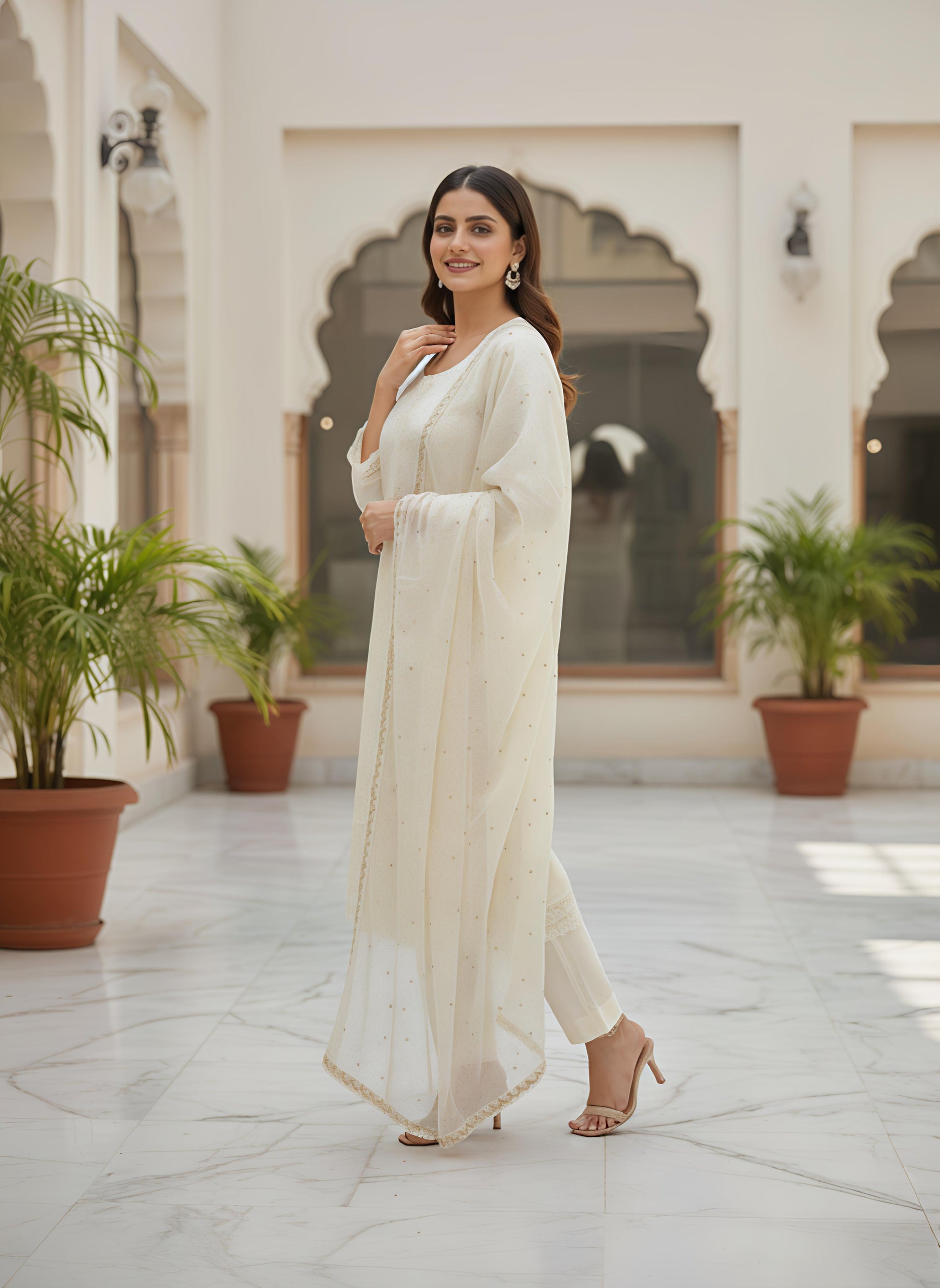 Grace meets simplicity in this ivory 3-piece suit, designed with subtle embroidery and delicate embellishments for a timeless appeal. The straight-cut kurta is paired with matching trousers, while the lightweight dupatta flows effortlessly with fine detailing along the border. Perfect for festive celebrations, formal gatherings, or serene daytime events, this outfit embodies understated sophistication and charm.