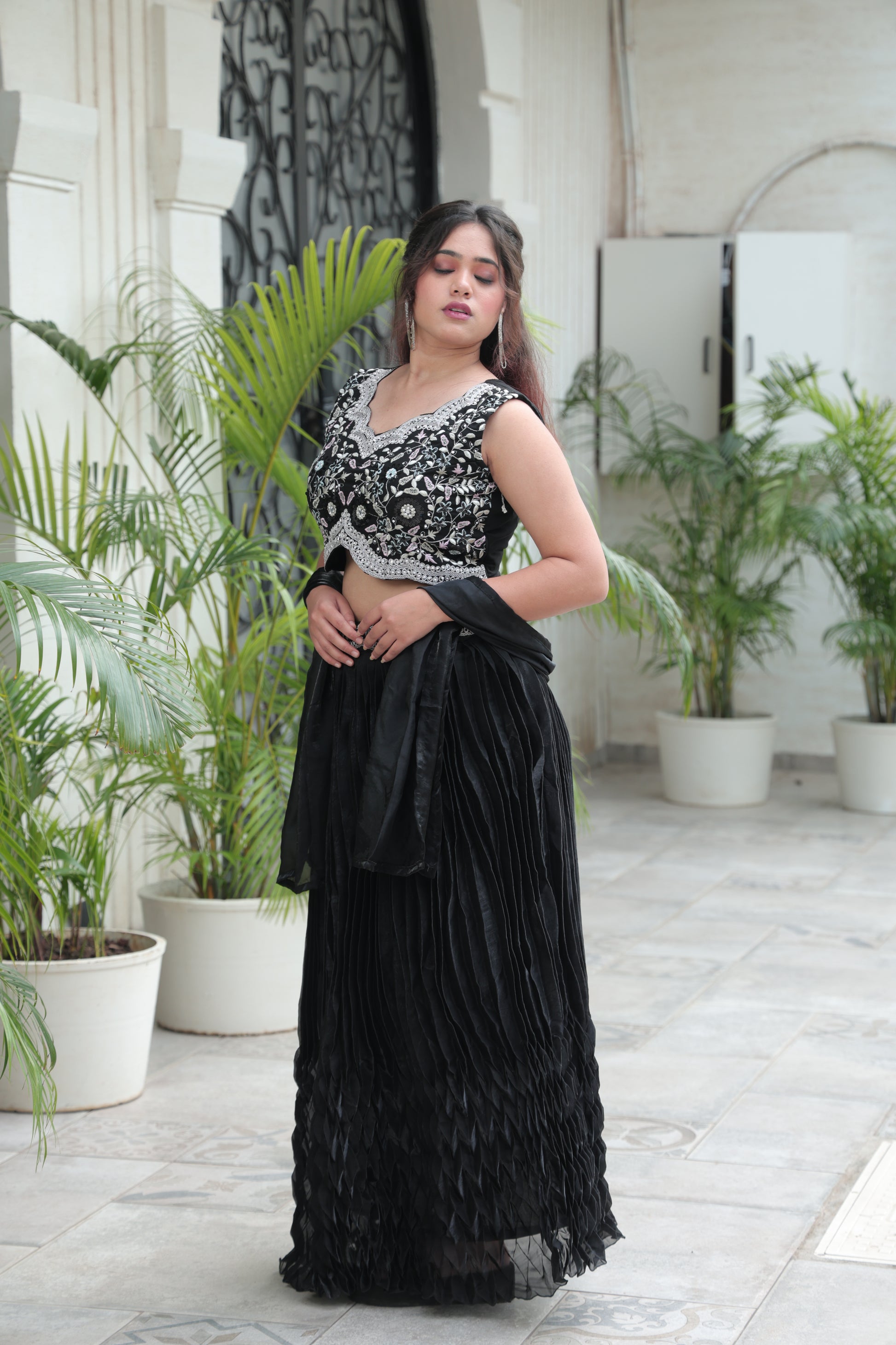 The set features a black crop blouse (choli) and a matching black skirt (lehenga).